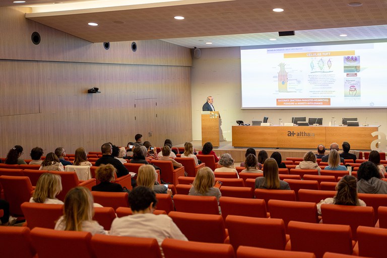 A continuació, Javier Santos Vicente, cap clínic de Gastroenterologia de l’Hospital Universitari Vall d’Hebron i responsable del Grup de Fisiologia i Fisiopatologia Digestiva de l’Institut de Recerca Vall d’Hebron, va parlar d’un tema emergent com és l’eix intestí-cervell. En els darreres temps s’ha avançat en l’estudi de la comunicació bidireccional que hi ha entre la microbiota intestinal i el cervell de les persones. En la ponència es va posar èmfasi en com desequilibris d’aquest eix podrien explicar el desenvolupament de certes malalties neurològiques degeneratives i el seu paper en la salut mental.